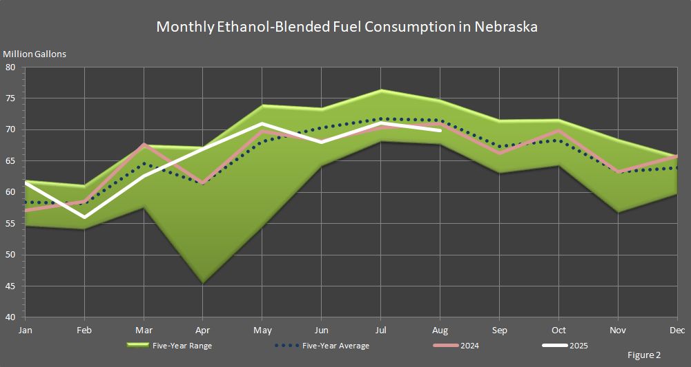 Sources: Monthly Motor–Fuel Consumption. Nebraska Department of Revenue, Motor Fuels Division, Lincoln, NE. Nebraska Department of Water, Energy, and Environment, Lincoln, NE.