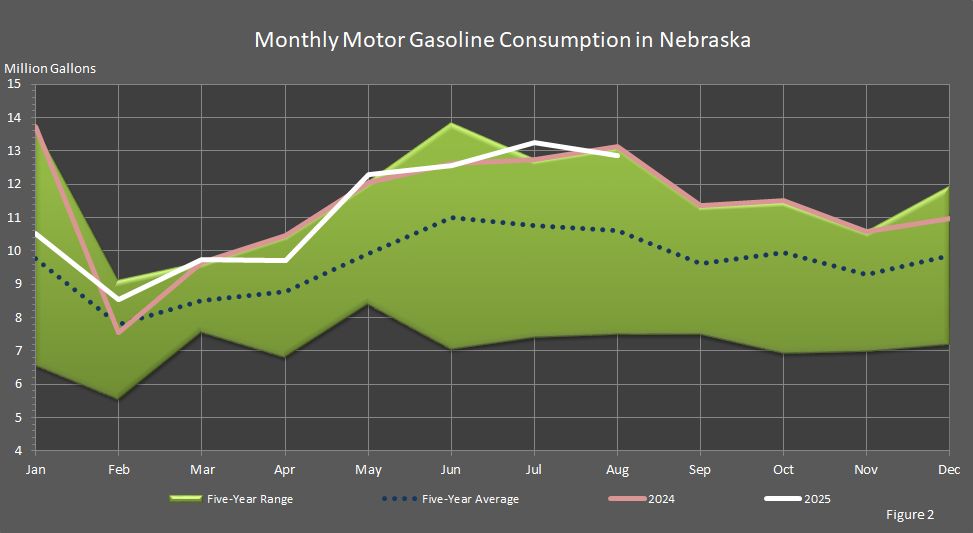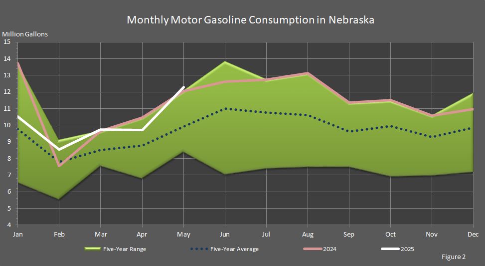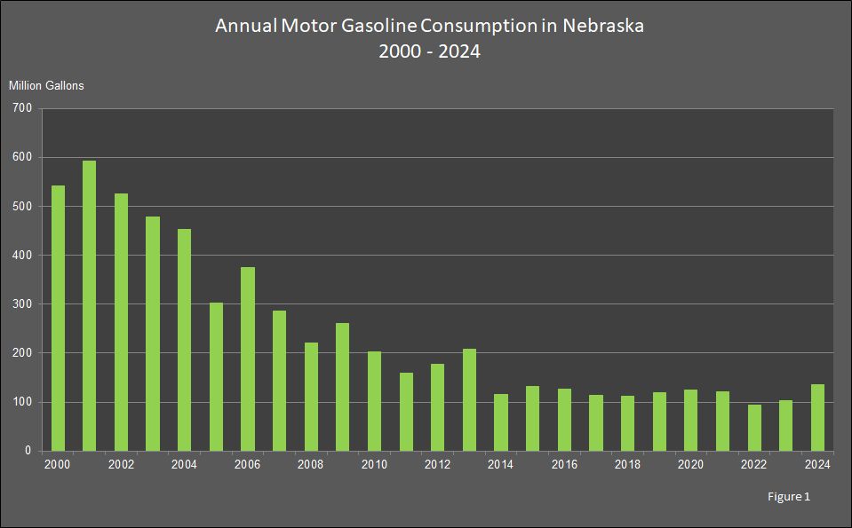 Sources: "Monthly Motor–Fuel Consumption." Nebraska Department of Revenue, Motor Fuels Division, Lincoln, NE. Nebraska Department of Water, Energy, and Environment, Lincoln, NE.