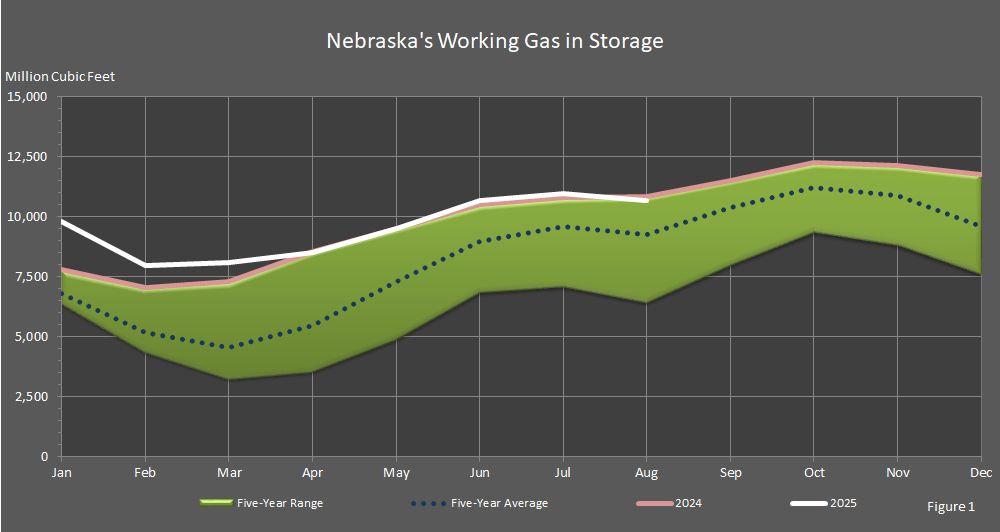 In August 2025, Nebraska had the capacity to store 12,653 million cubic feet (mmcf) of working natural gas or working gas, and there was 10,674 mmcf working gas according to the Energy Information Administration estimates. As shown in Figure 1 and the data table below, this volume of working gas was a decrease of 291 mmcf (or 3 percent) from July 2025 and down 2 percent from August 2024. Stocks were higher than the five–year average, equivalent to August 2024's stocks, and at the upper boundary of the five–year range.